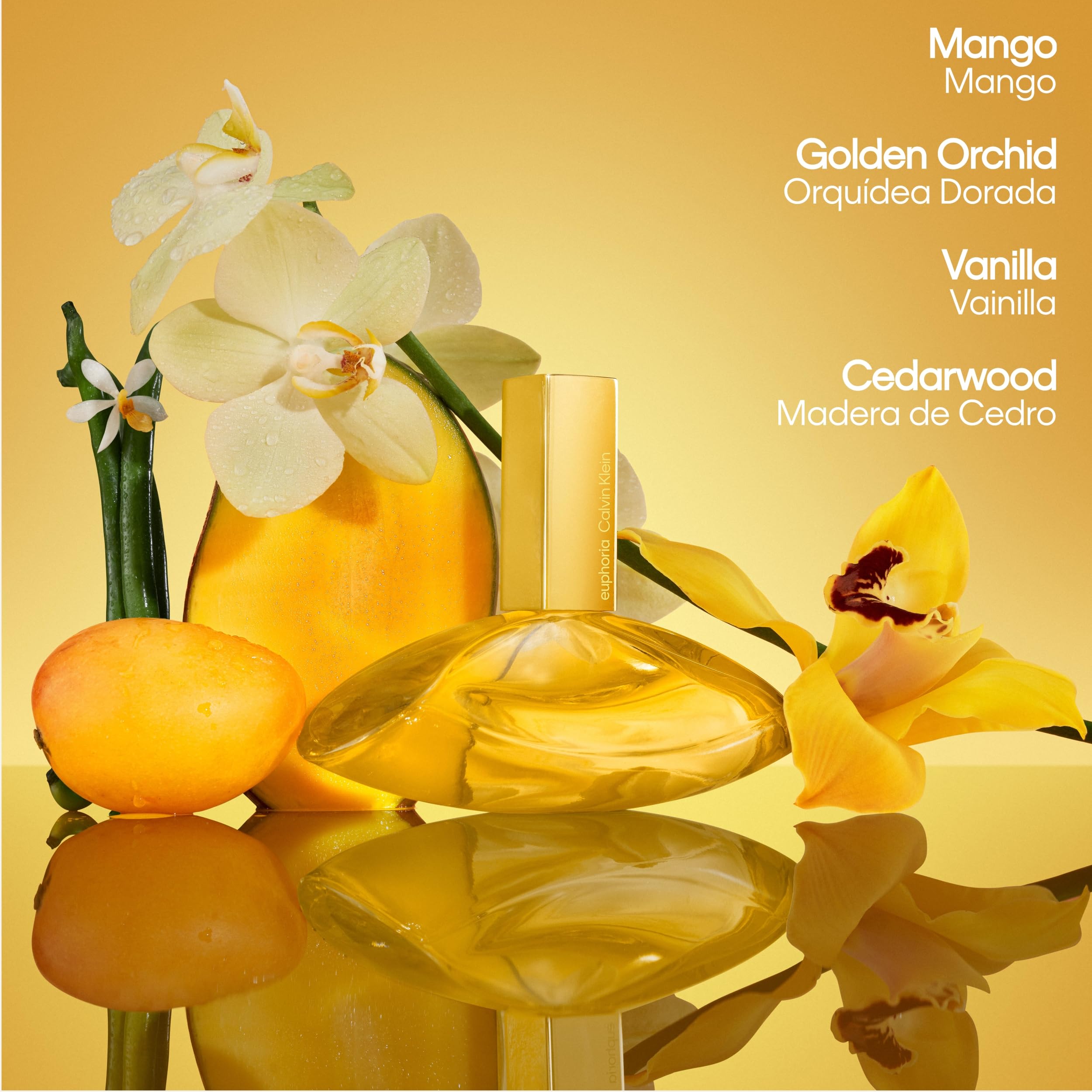 - Euphoria Solar Key Notes: Mango, Golden Orchid, Vanilla Extract & Cedarwood Essence